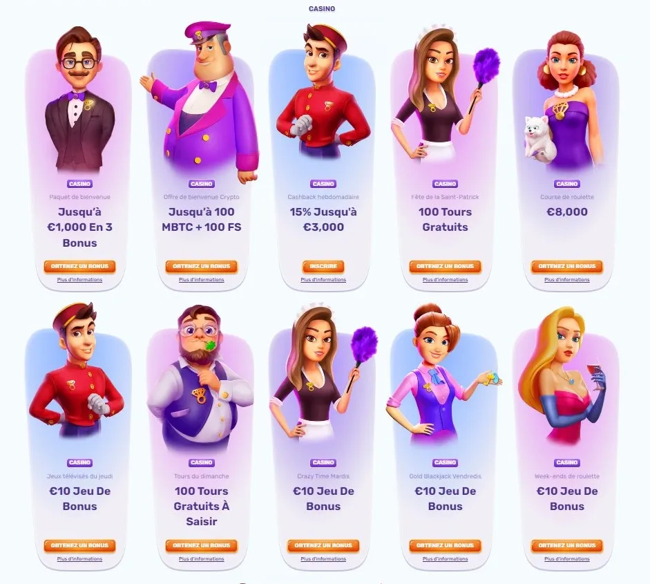 Le casino Slotspalace propose une variété de bonus de casino conçus pour augmenter les chances de gain des joueurs et diversifier leur expérience de jeu. Cela inclut à la fois des bonus de bienvenue et des promotions pour les clients réguliers, notamment des tours gratuits de Slotspalace, qui vous permettent de jouer à des machines à sous sélectionnées sans avoir à utiliser vos propres fonds.